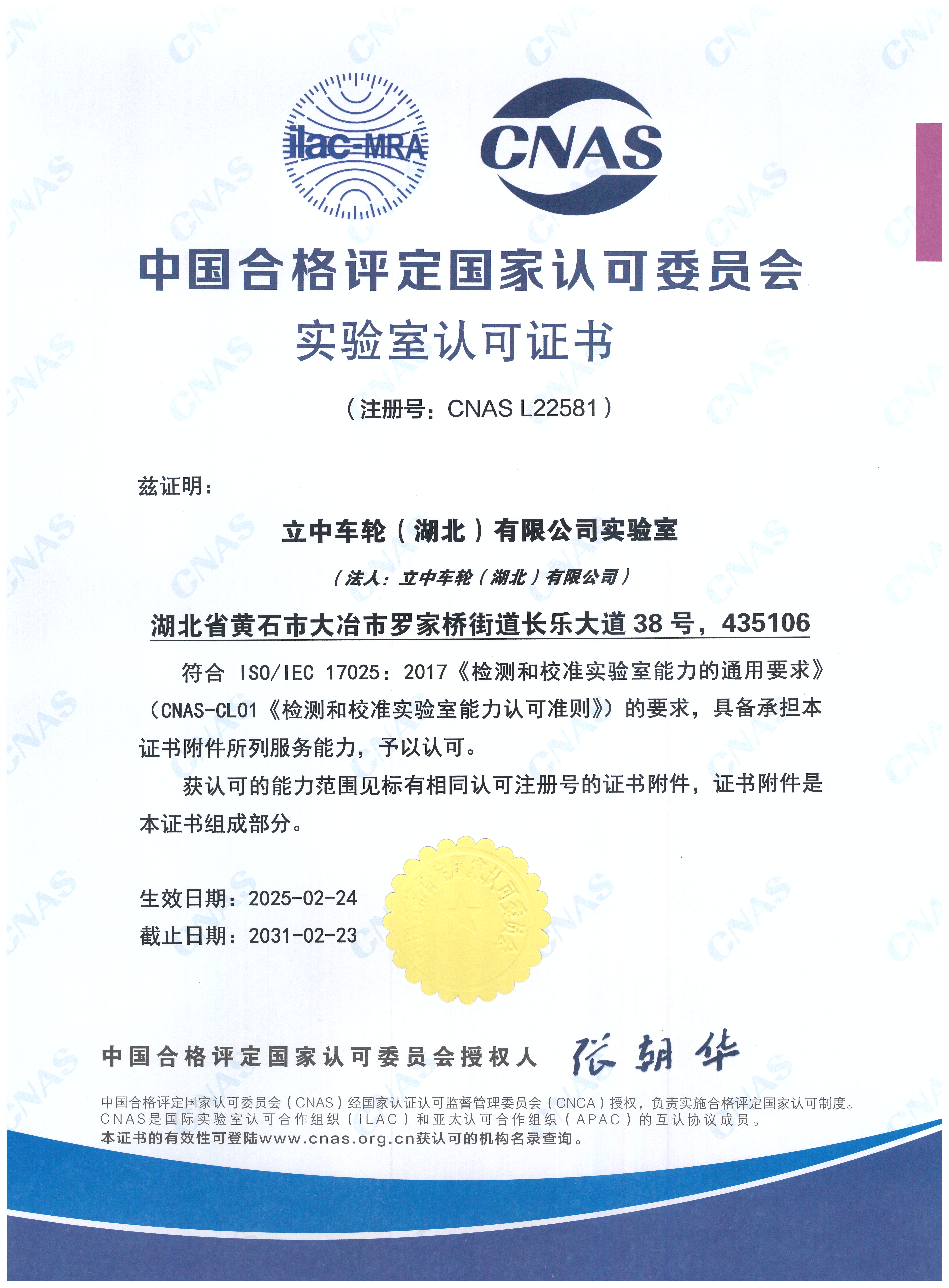 Lizhong Wheel Group currently has certification qualifications: IATF16949:2016, ISO14001, ISO/IEC17025, TUV (Germany), TIP (General Motors), CEP (Russia), VIA (Japan), INMETRO (Brazil), ARAI (India), etc.